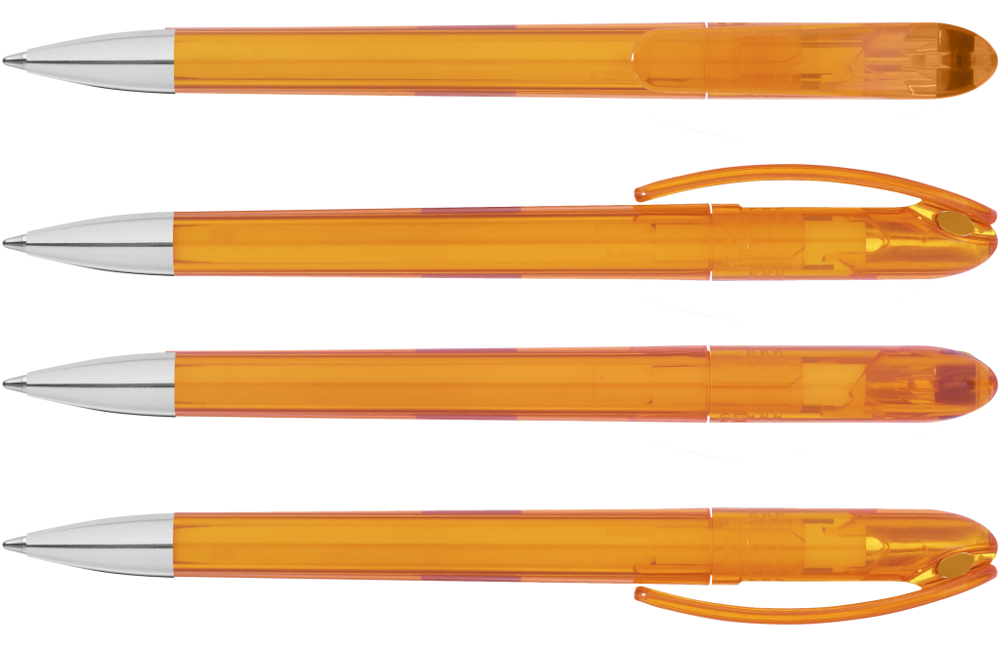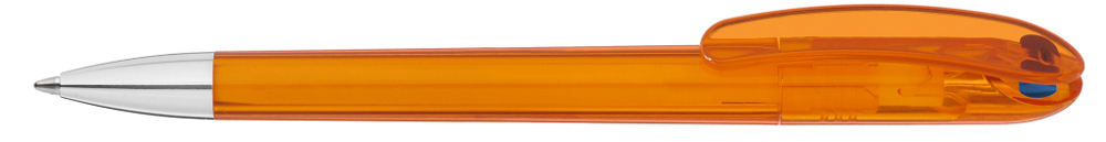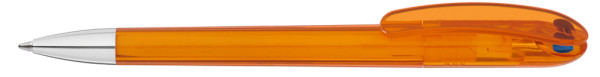 Drehkugelschreiber mit transparent glänzendem Gehäuse und farbigem Stopfen. Schwere Metallspitze glanzverchromt.