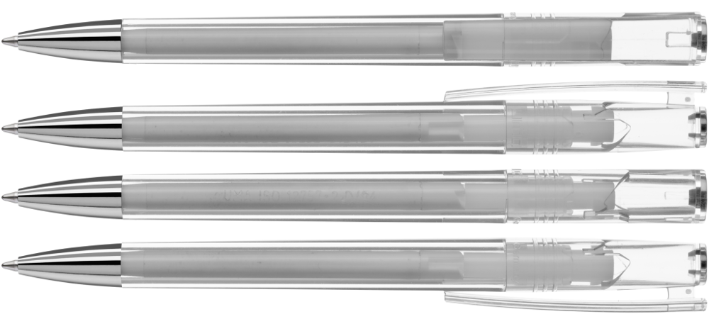 Drehkugelschreiber mit transparent glänzendem Gehäuse und silbernem Stopfen im Oberteil. Schwere Metallspitze glanzverchromt.