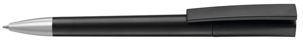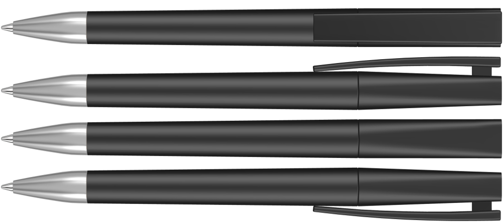 Drehkugelschreiber mit gedeckt mattem Gehäuse in weiß oder schwarz und Stopfen optional in verschiedenen matt gedeckten Farben oder silber erhältlich. Schwere Metallspitze matt verchromt.