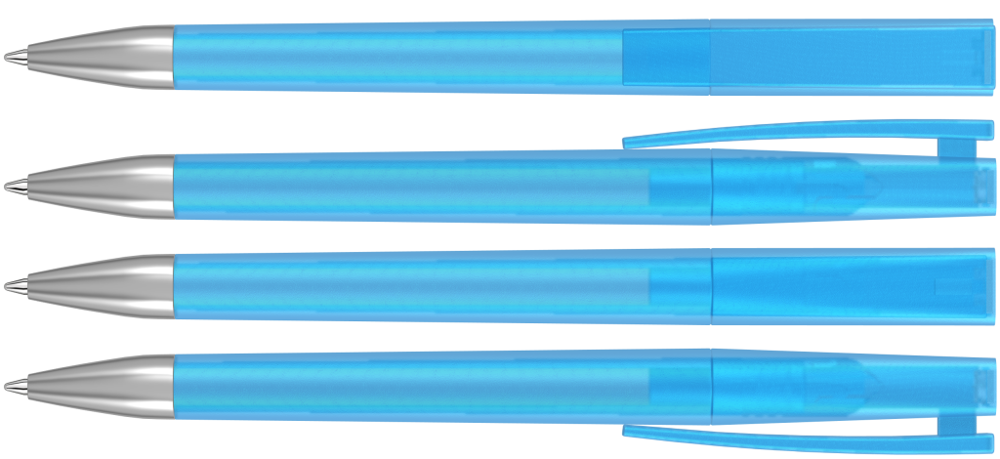 Drehkugelschreiber mit transparent gefrostetem Gehäuse und Stopfen optional in verschiedenen matt gedeckten Farben oder silber erhältlich. Schwere Metallspitze matt verchromt.