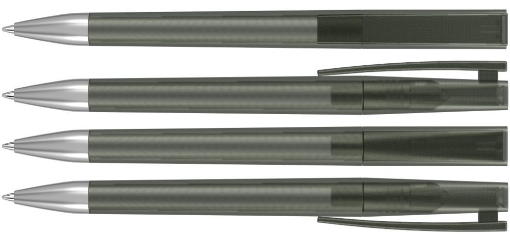 Drehkugelschreiber mit transparent gefrostetem Gehäuse und Stopfen optional in verschiedenen matt gedeckten Farben oder silber erhältlich. Schwere Metallspitze matt verchromt.