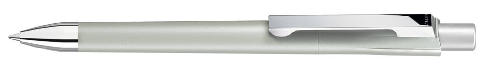 Druckkugelschreiber mit gedeckt mattem Gehäuse. Schwere Metallspitze und Metallclip glanzverchromt.