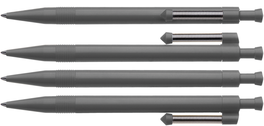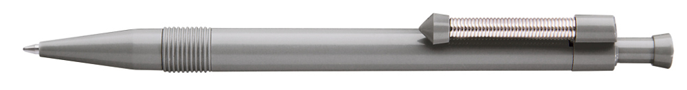 Druckkugelschreiber mit gedecktem Gehäuse und flexiblem und vernickeltem Metallfederclip.