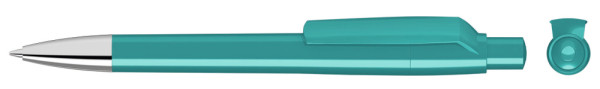 Druckkugelschreiber mit gedeckt glänzendem Gehäuse, Clip, Drücker und Stopfen. Spitze glanzverchromt.