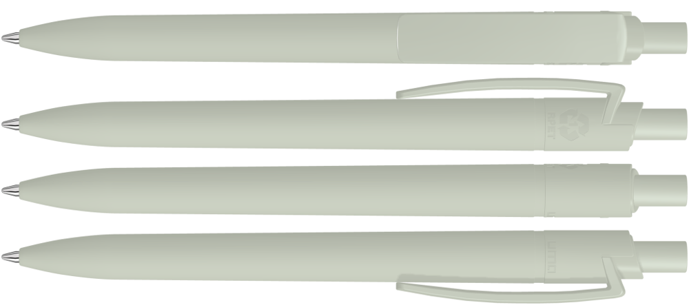 Druckkugelschreiber mit gummiertem Gehäuse aus recyceltem PET-Material mit matt gedecktem Clip und Drücker.