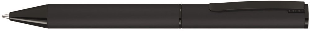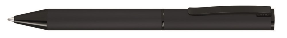 Metall-Drehkugelschreiber mit Softtouch-Gehäuse, Softdrehmechanik und gefedertem Metallclip. Beschlagteile schwarz glänzend lackiert.