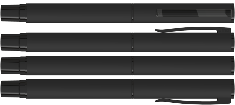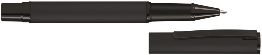 Metall-Rollerball mit Softtouch-Gehäuse und gefedertem Metallclip. Beschlagteile schwarz glänzend lackiert.
