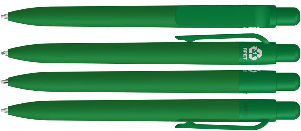 Druckkugelschreiber aus recyceltem PET-Material mit gummiertem Gehäuse und gedeckt mattem Clip, Drücker und Stopfen.