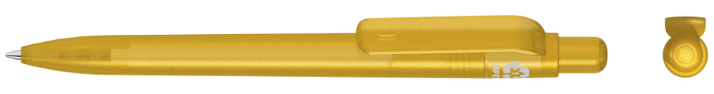 Druckkugelschreiber aus recyceltem PET-Material mit transparent gefrostetem Gehäuse, Clip, Drücker und Stopfen.