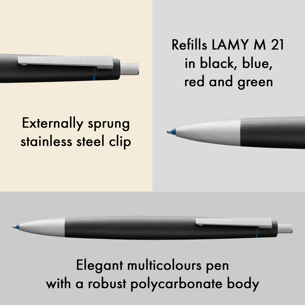 Am Anfang war der LAMY 2000: Seit 1966 schreibt die Ikone Designgeschichte. Damals wie heute ist der LAMY 2000 ein fester Ankerpunkt des LAMY Designs. Er sticht vor allem durch sein hohes Niveau an Ingenieurskunst heraus und verkörpert eine einzigartige Symbiose aus Ästhetik und Funktionalität. Erleben Sie ein Schreibgefühl der Premiumklasse dank nahtloser Materialkombinationen, fremdgefedertem Edelstahlclip und angenehmer Ausbalancierung des Körpers. Mehrfarbkugelschreiber mit Druckknopfmechanik und Sichtwahlautomatik. Mit LAMY Kugelschreiber-Minen M 21 in den Farben schwarz, blau, rot und grün. / Mit Geschenketui