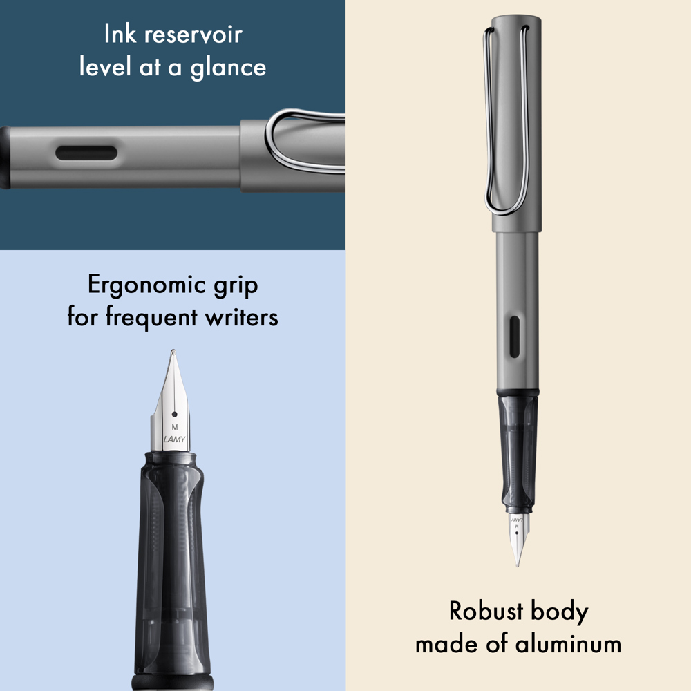 Leicht, leichter, LAMY AL-star: Der Schreibklassiker aus widerstandsfähigem Aluminium meistert alle Herausforderungen des Alltags mit Eleganz. Das transparente Griffstück liegt angenehm in der Hand und macht mit freiem Blick auf den Tintenleiter das Funktionale zum optischen Highlight.