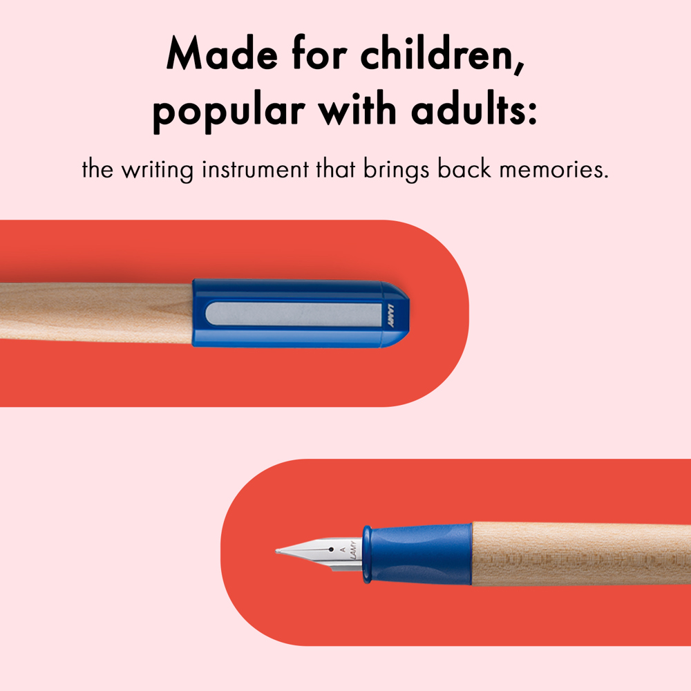 Kinder, die mit LAMY schreiben, lernen leichter – das gilt besonders für das Schreiblernsystem LAMY abc. Es hat sich seit mehreren Generationen als altersgerechter Einstieg ins Schreiben lernen bewährt. Die Kombination aus Füller und Bleistift wurde in enger Zusammenarbeit mit Pädagog:innen entwickelt und ist somit speziell auf die Bedürfnisse von Kindern abgestimmt. Das ergonomische Griffstück fördert eine gesunde Stifthaltung und unterstützt die Entwicklung der feinmotorischen Fähigkeiten. Mit dem LAMY abc helfen Sie Ihrem Kind, den Grundstein für entspanntes, flüssiges und sauberes Schreiben zu legen – ein Leben lang. Schreiblernfüller aus Ahornholz, Kappe und Würfel aus Kunststoff blau, rutschfestes, gummiertes Griffstück, Stahlfeder, poliert