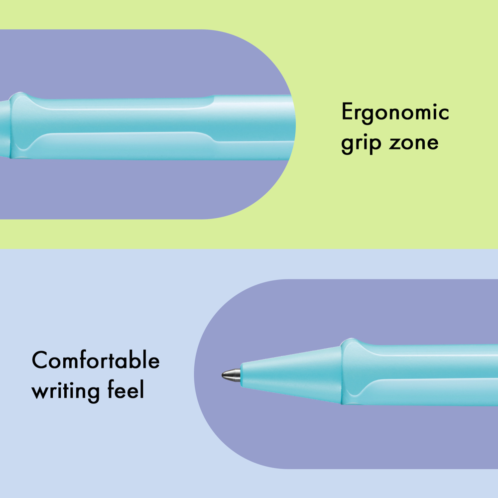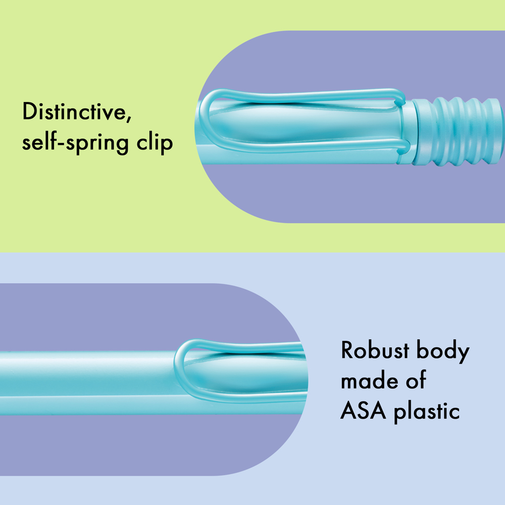 Der LAMY safari ist mehr als die Summe seiner Details: Er ist ästhetisch, robust und individuell. Der markante, selbstfedernde Clip hält das Schreibgerät sicher an Ort und Stelle befestigt. Das Gehäuse aus schlagzähem Kunststoff macht ihn zum robusten Begleiter in jedem Umfeld und die abgeflachte Form verhindert versehentliches Wegrollen. Funktionale Details wie subtil ergonomisch geformte Griffflächen und ein Sichtfenster zur Kontrolle des Tintenstands fügen sich wie selbstverständlich in das Design ein und machen den LAMY safari zum modernen Klassiker. Aus robustem ABS-Kunststoff, griffsympathisch durch markante Griffmulden, mit selbstfederndem Metallclip,