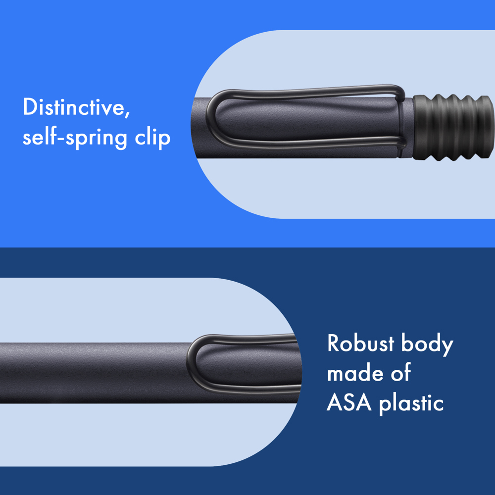 Der LAMY safari ist mehr als die Summe seiner Details: Er ist ästhetisch, robust und individuell. Der markante, selbstfedernde Clip hält das Schreibgerät sicher an Ort und Stelle befestigt. Das Gehäuse aus schlagzähem Kunststoff macht ihn zum robusten Begleiter in jedem Umfeld und die abgeflachte Form verhindert versehentliches Wegrollen. Funktionale Details wie subtil ergonomisch geformte Griffflächen und ein Sichtfenster zur Kontrolle des Tintenstands fügen sich wie selbstverständlich in das Design ein und machen den LAMY safari zum modernen Klassiker. Aus robustem ABS-Kunststoff, griffsympathisch durch markante Griffmulden, mit selbstfederndem Metallclip,