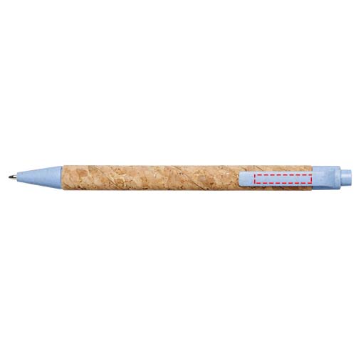 Umweltfreundlicher Kugelschreiber mit Klickmechanismus, Korkgriff und Weizenstrohverzierungen in verschiedenen Farben. Bei Weizenstroh handelt es sich um zurückgebliebene Stiele nach der Ernte von Weizenkörnern. Dadurch wird die Menge an Kunststoff reduziert und eine umweltfreundliche Alternative geschaffen. Die Farbe des Korkmaterials kann variieren.
