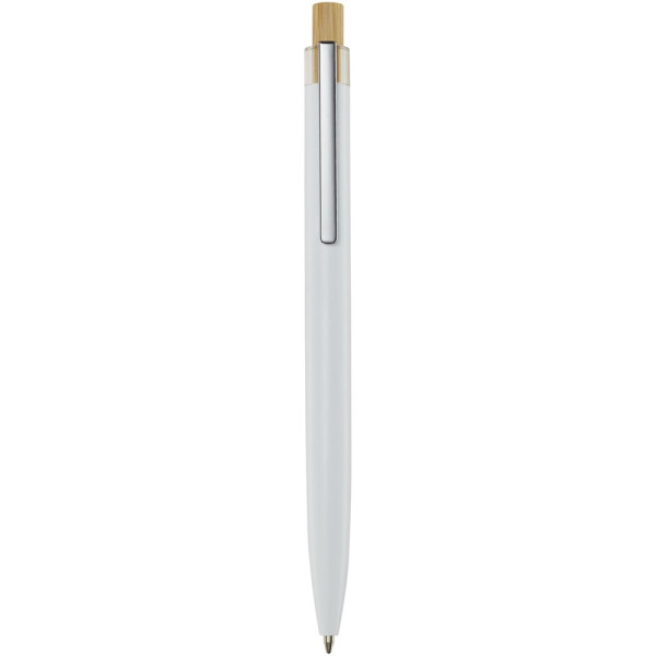Der Nooshin Kugelschreiber wird aus recyceltem Aluminium hergestellt, was weniger Energie benötigt als die Herstellung von Aluminium aus Rohstoffen. Es reduziert außerdem die Abfallmenge auf Mülldeponien und trägt dazu bei, natürliche Ressourcen zu schonen und Treibhausgasemissionen zu reduzieren. Druckknopf ist aus Bambus gefertigt. Tintenfarbe: Blau. Schreiblänge: 800 Meter. Spitzengröße: 1,00 mm.