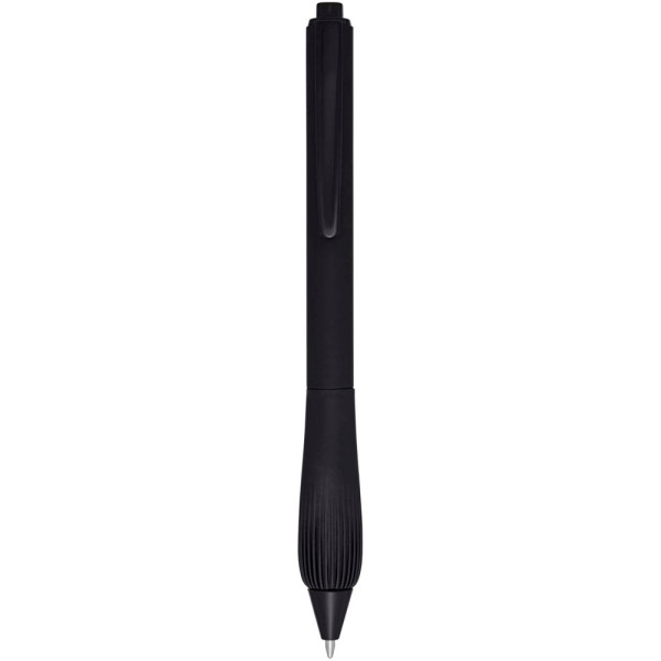 Kugelschreiber aus recyceltem Kunststoff mit gummiertem Schaft und Griff aus TPR. Tintenfarbe: Schwarz. Schreiblänge: 1000 Meter. Strichstärke: 1,0 mm.