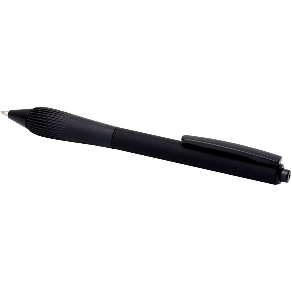 Kugelschreiber aus recyceltem Kunststoff mit gummiertem Schaft und Griff aus TPR. Tintenfarbe: Blau. Schreiblänge: 1000 Meter. Strichstärke: 1,0 mm.
