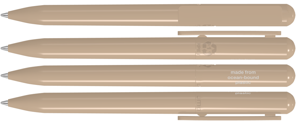 Drehkugelschreiber aus recyceltem PET-Material aus Ocean Bound Plastic mit gedeckt glänzendem Gehäuse. Das durch Plastic Bank gesammelte Ocean Bound Plastic, auch bekannt als Social Plastic®, wird in Europa zu einem recycelten PET Schreibgerät für einen langlebigen und nachhaltigen Werbeeinsatz upgecycelt.