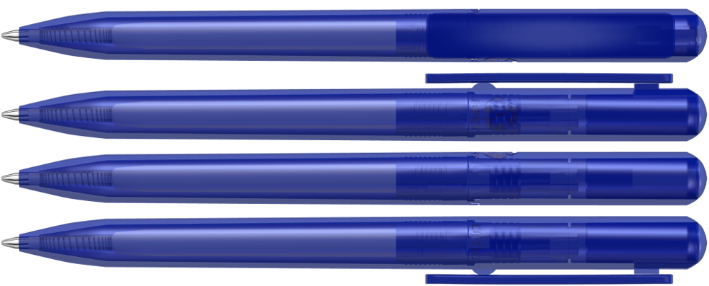 Drehkugelschreiber aus recyceltem PET-Material mit transparent glänzendem Gehäuse.