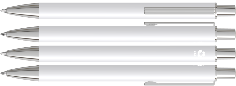 Metall-Druckkugelschreiber mit matter Oberfläche aus recyceltem Aluminium. Metallclip mit eingelassenen Rillen, Metallspitze und Drücker in silber glänzend.
