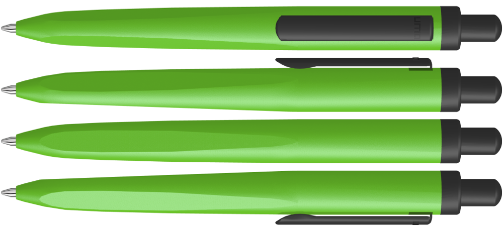 Metall-Druckkugelschreiber mit gemetrisch wechselnder Schaftform, die sich zur Schreibspitze hin in eine prägnante Dreikantgeometrie verjüngt. Aluminiumgehäuse matt lackiert, Clip und Drücker in schwarz matt.