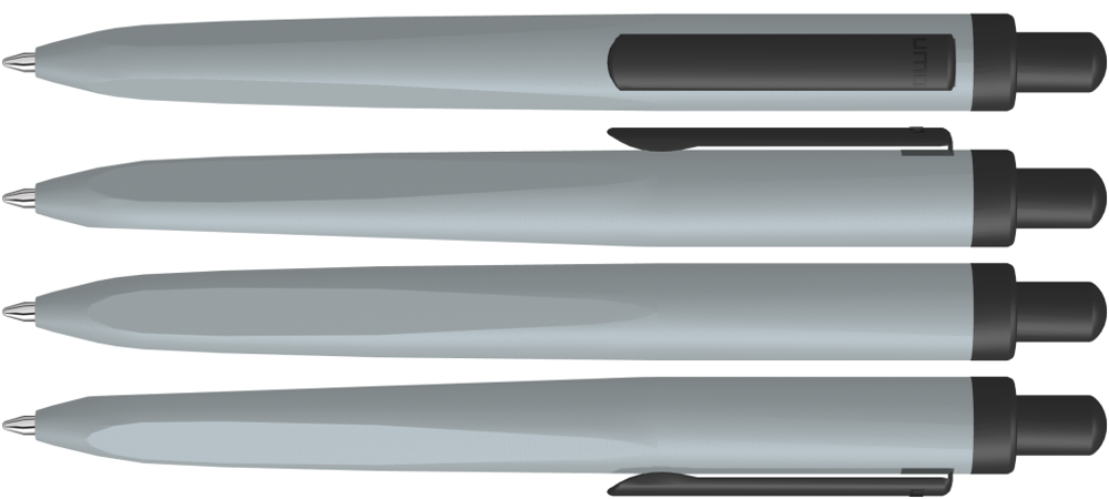 Metall-Druckkugelschreiber mit gemetrisch wechselnder Schaftform, die sich zur Schreibspitze hin in eine prägnante Dreikantgeometrie verjüngt. Aluminiumgehäuse matt lackiert, Clip und Drücker in schwarz matt.