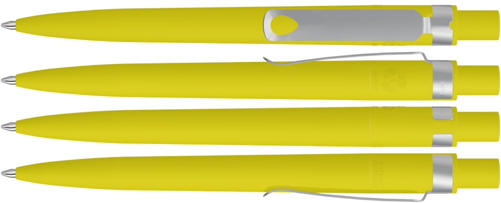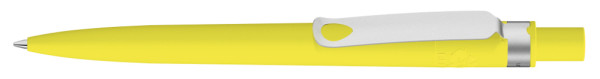 Druckkugelschreiber mit gummiertem Gehäuse aus recyceltem PET-Material mit Metallclip matt verchromt.
