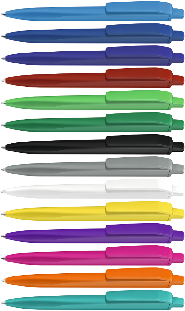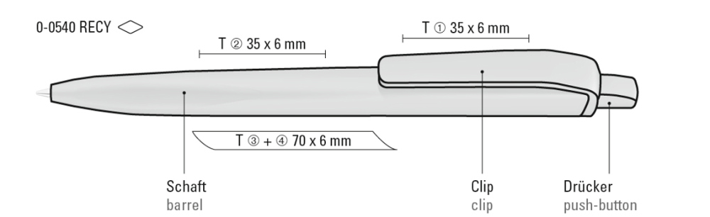 Druckkugelscheiber mit gedeckt mattem Gehäuse, Clip und Drücker aus recyceltem ABS-Kunststoff. Griffzone ergonomisch geformt.