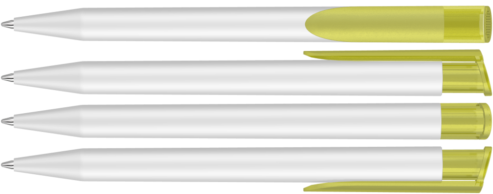 Druckkugelschreiber mit gedeckt mattem Gehäuse in weiß und farbig transparent gefrostetem Clipdrücker.