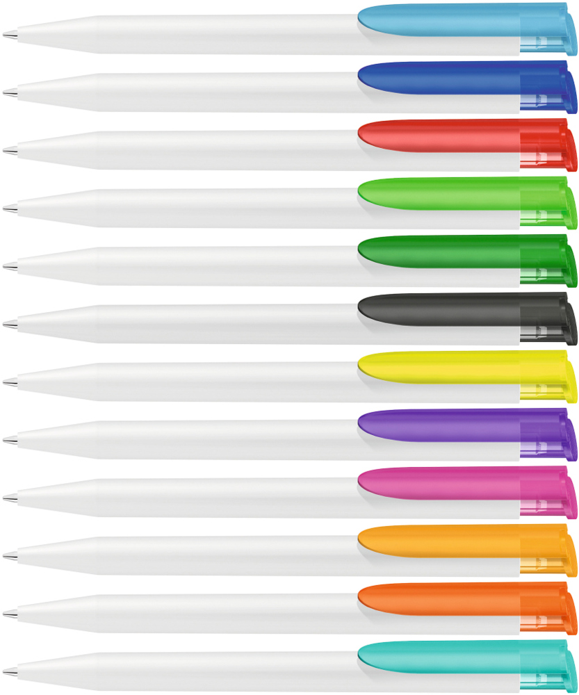 Druckkugelschreiber mit gedeckt mattem Gehäuse in weiß und farbig transparent gefrostetem Clipdrücker.