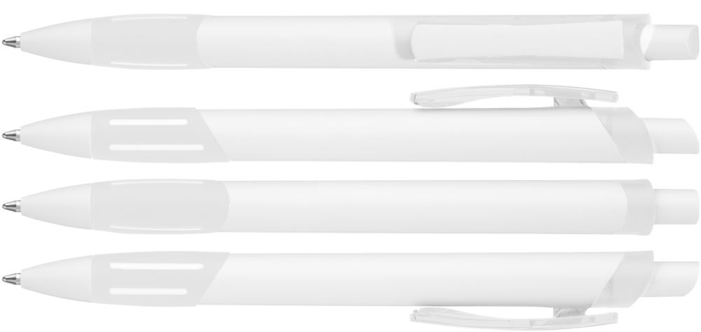 Druckkugelschreiber mit gedeckt weißem Gehäuse, transparent gefrosteter Gummigriffzone, Zierring und Clipschale.