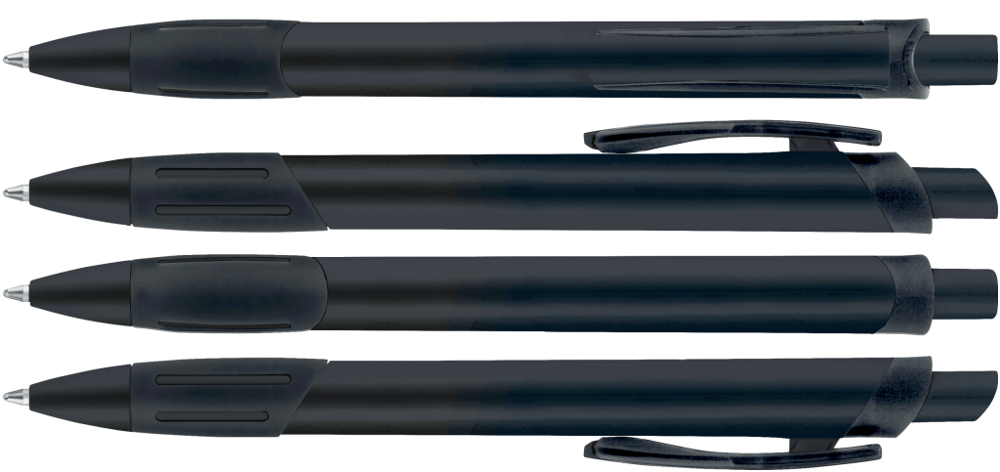 Druckkugelschreiber mit gedeckt weißem Gehäuse, transparent gefrosteter Gummigriffzone, Zierring und Clipschale.
