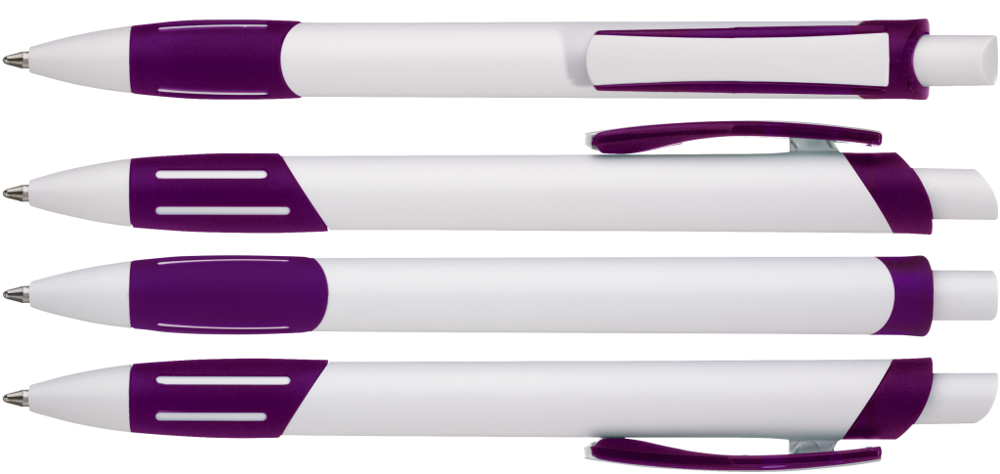 Druckkugelschreiber mit gedeckt weißem Gehäuse, transparent gefrosteter Gummigriffzone, Zierring und Clipschale.