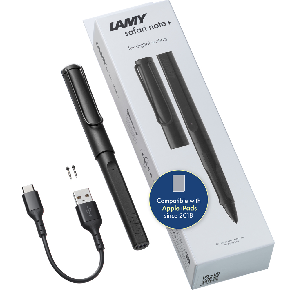 Ikonisches, unverwechselbares Design, perfekte Ergonomie und höchste Qualität machen den LAMY safari note+ zu einem echten Schreibgerät für die digitale Welt – passend für alle, die in der Apple-Welt zu Hause sind. Der LAMY safari note+ ist der einzige seiner Klasse mit ergonomischem Design und einer Kappe zum Schutz der Spitze. Verfügbar in mehreren Farben, verkörpert der LAMY safari note+ zudem die bewährte Lamy-Tradition der Selbstentfaltung und Individualität durch Farbauswahl. Einfach einschalten und loslegen: Ob Zeichnen, Malen, Organisieren, Bilder bearbeiten, Videos schneiden oder Spielen – der LAMY safari note+ ist ein vielseitiger Begleiter im Alltag, bei der Arbeit, in der Uni oder Schule für die Nutzung verschiedenster Apps auf dem iPad. Ein Schreiberlebnis, das über einfache Notizen hinausgeht – präzise, reaktionsschnell und inspirierend. Die Einsatzmöglichkeiten der digitalen Schreibgeräte von LAMY sind nahezu unbegrenzt. Sie geben jeder Persönlichkeit, jedem Lebensgefühl und jeder Botschaft ihre ganz individuelle Ausdrucksform. Ergonomische Griffzone; Zwei konfigurierbare Funktionstasten*; weiche, auswechselbare Spitze; selbstfedernder Bügelclip; Kappe zum Schutz der Spitze; USB-C Ladefunktion; Handballenerkennung; Druckempfindlichkeit*; Neigungsempfindlichkeit; keine Koppelung erforderlich; Bis zu 10 Stunden Akkulaufzeit; 1 Stunde Batterieladezeit Lieferumfang: LAMY safari note+ all black, 2 Ersatzspitzen, USB-A zu USB-C Ladekabel *nur bei Partner-Apps, mehr Infos finden Sie hier: lamy.com/noteplus