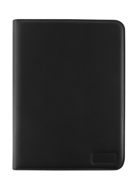 Business Class-Portfolio mit umlaufendem Reißverschluss, schwarzer Metallplakette und neuer Aufteilung. DIN A4 Format, VPE 20. 3 Kartenfächer, A4 Blattfach, Reißverschlussfach, Stiftschlaufe, 50 Blatt Block, Handy- und Tablet Halterung.