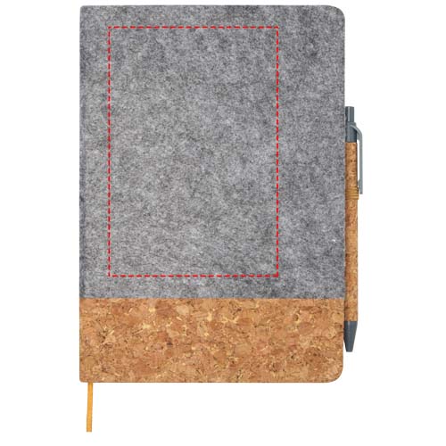 Das Hardcover Notizbuch im Format A5 besteht aus Kork und recyceltem Filz. Es enthält 80 Blatt liniertes 70 g/m² Papier, einen elastischen Verschluss, ein Lesebändchen und eine Stiftschlaufe. Knopf, Clip und Spitze des Kugelschreibers sind aus recyceltem Kunststoff, der Schaft ist aus Kork. Tinte: Schwarz. Schreiblänge: 600 Meter. Spitzengröße: 1,0 mm.