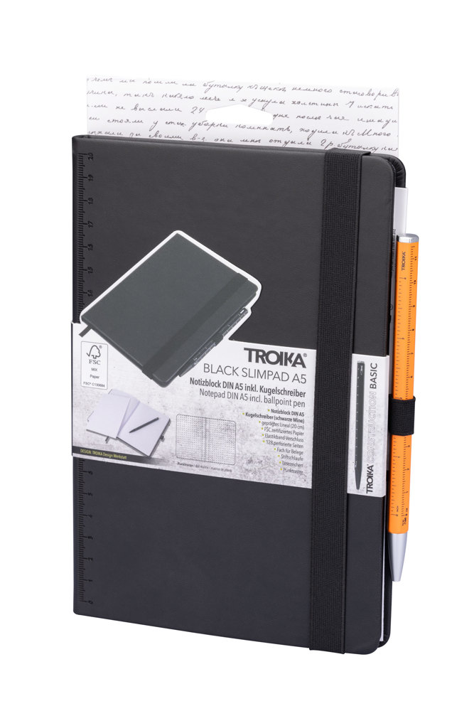 Notizblock DIN A5 inkl. Kugelschreiber, schwarzem Elastikband-Verschluss, Stiftschlaufe, Lesezeichen, geprägtes Lineal (20 cm) auf Cover, FSC zertifiziertes Papier, 64 perforierte Blätter (128 Seiten), mit schwarz eingefärbten Seitenrändern, Punktraster, Fach für Belege, Kugelschreiber CONSTRUCTION BASIC (schwarze D1 Mine), Kunstleder, Metall, matt, schwarz