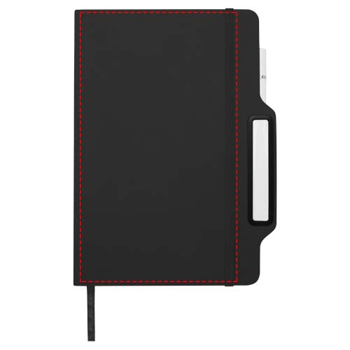 Das Nexus A5 Hardcover Notizbuch mit Stift/Bleistift-Kombi umfasst 80 cremefarbene, linierte Seiten aus 70 g/m² Papier, abgerundete Ecken, einen elastischen Verschluss und ein Lesebändchen. Der Stift hat zwei Köpfe, von denen der eine ein Füller mit schwarzer Tinte und der andere ein Bleistift ist. Schreiblänge des Stiftes: 1000 Meter. Schreibspitze: 1 mm.