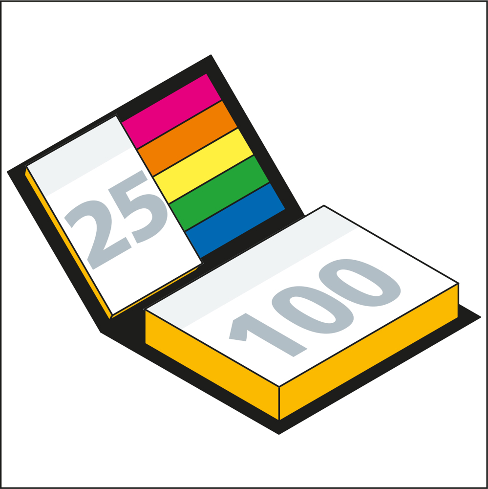 • Ausstattung: Spiegel schwarz; Haftnotiz 100 × 72 mm, 100 Blatt Haftpapier weiß; Haftnotiz 50 × 72 mm, 25 Blatt Haftpapier weiß; Standard-Farbschnitt: Kanten beider Haftnotiz-Blöcke farbig; Haftmarker-Set (5 × 20 farbige Marker)