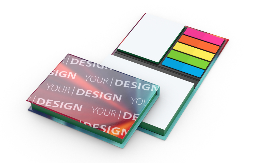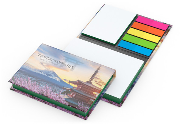 Das Kombi-Set Wien Bestseller mit Farbschnitt kombiniert exklusives Design mit praktischen Funktionen. Mit Farbschnitt, zwei Haftnotiz-Blöcke, einem Haftmarker-Set und einem individuell bedruckbaren Umschlag ist es die ideale Wahl für hochwertige und kreative Werbemittel.