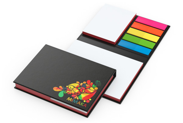 • Ausstattung: Spiegel schwarz; Haftnotiz 100 × 72 mm, 50 Blatt Haftpapier weiß; Haftnotiz 50 × 72 mm, 50 Blatt Haftpapier weiß; Standard-Farbschnitt: Kanten beider Haftnotiz-Blöcke farbig; Haftmarker-Set (5 × 20 farbige Marker)