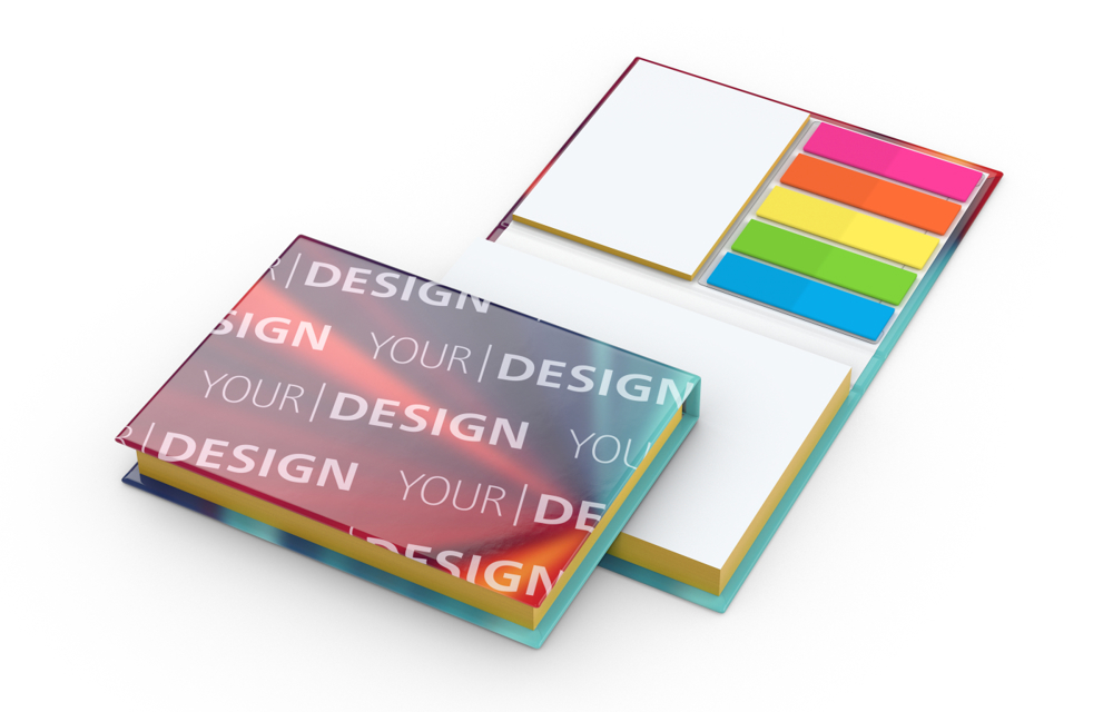 • Ausstattung: Haftnotiz 100 × 72 mm, 100 Blatt Haftpapier weiß; Haftnotiz 50 × 72 mm, 25 Blatt Haftpapier weiß; Standard-Farbschnitt: Kanten beider Haftnotiz-Blöcke farbig; Haftmarker-Set (5 × 20 farbige Marker)