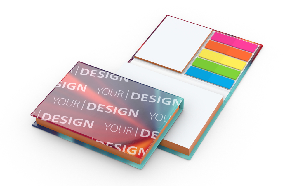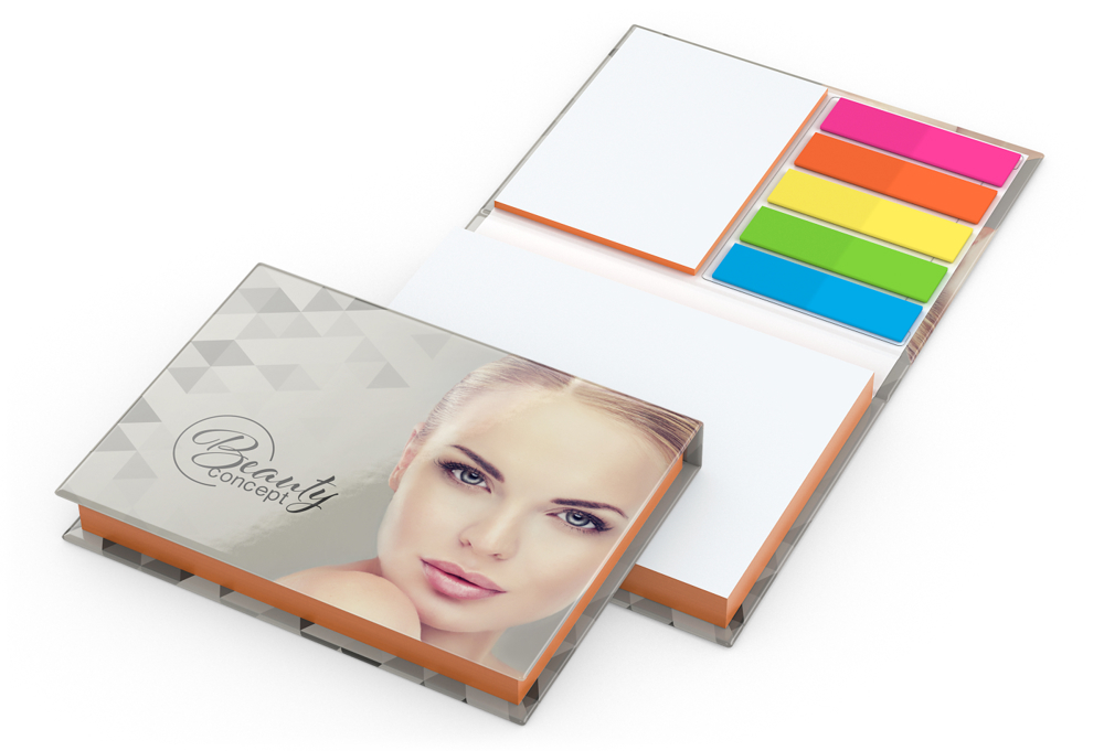 • Ausstattung: Haftnotiz 100 × 72 mm, 100 Blatt Haftpapier weiß; Haftnotiz 50 × 72 mm, 25 Blatt Haftpapier weiß; Standard-Farbschnitt: Kanten beider Haftnotiz-Blöcke farbig; Haftmarker-Set (5 × 20 farbige Marker)