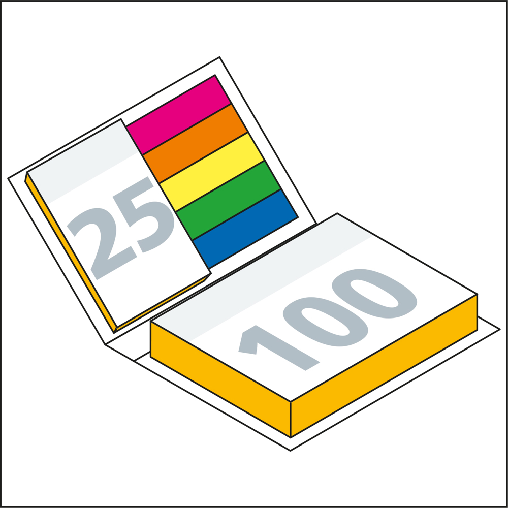 • Ausstattung: Haftnotiz 100 × 72 mm, 100 Blatt Haftpapier weiß; Haftnotiz 50 × 72 mm, 25 Blatt Haftpapier weiß; Standard-Farbschnitt: Kanten beider Haftnotiz-Blöcke farbig; Haftmarker-Set (5 × 20 farbige Marker)