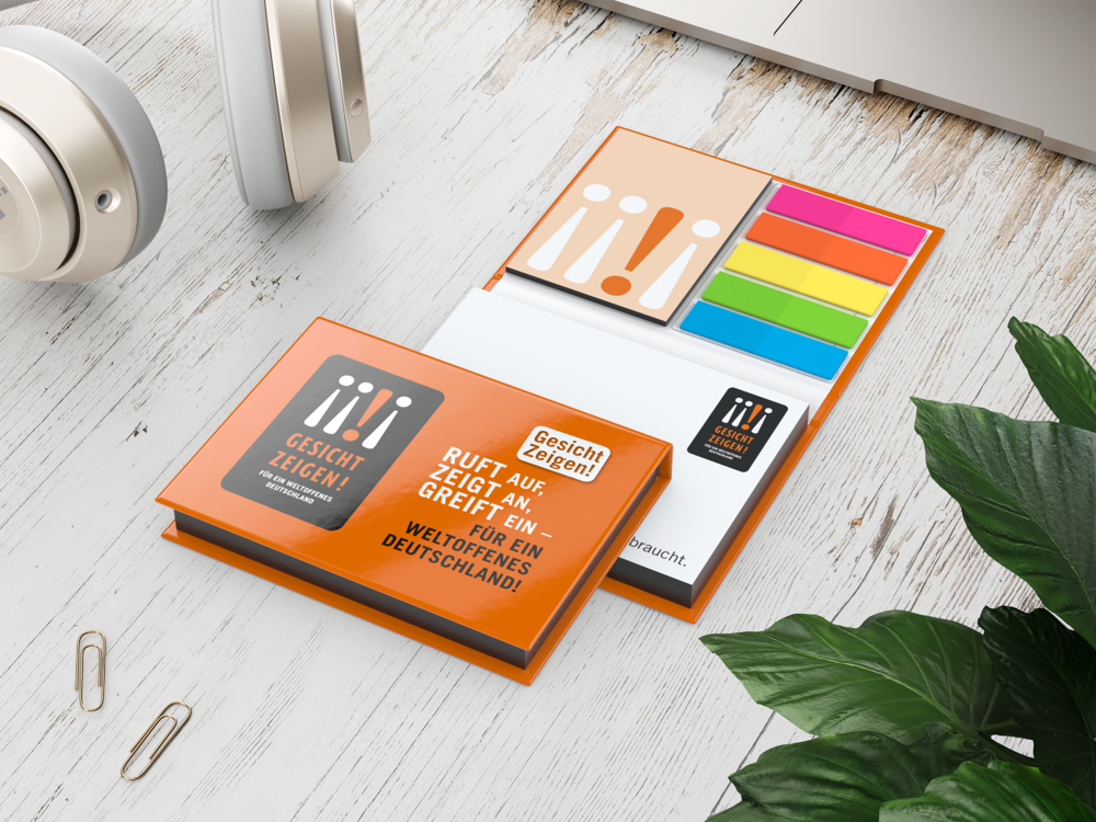 • Ausstattung: Haftnotiz 100 × 72 mm, 100 Blatt Haftpapier weiß; Haftnotiz 50 × 72 mm, 25 Blatt Haftpapier weiß; Color-Farbschnitt: Kanten beider Haftnotiz-Blöcke in einer Wunschfarbe nach CMYK; Haftmarker-Set (5 × 20 farbige Marker)