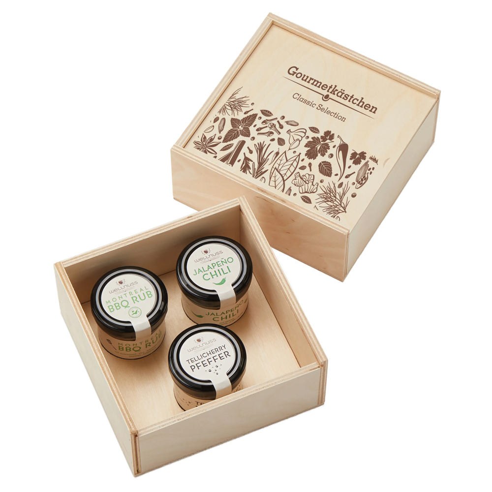 Gourmetkästchen mit 3 Gourmet Gewürzen im Glas