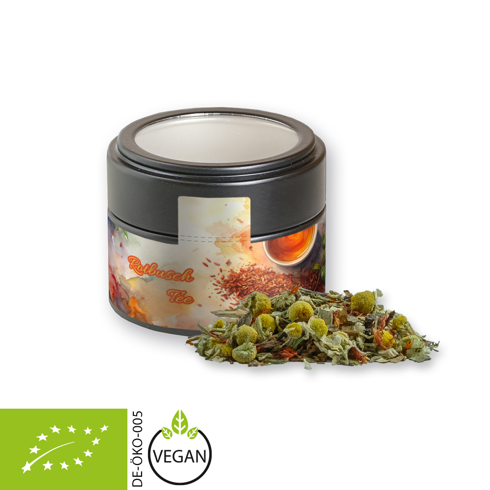 Bio Rotbuschtee Entspannungszeit, ca. 25g, Metalldose Mini mit Sichtfenster schwarz