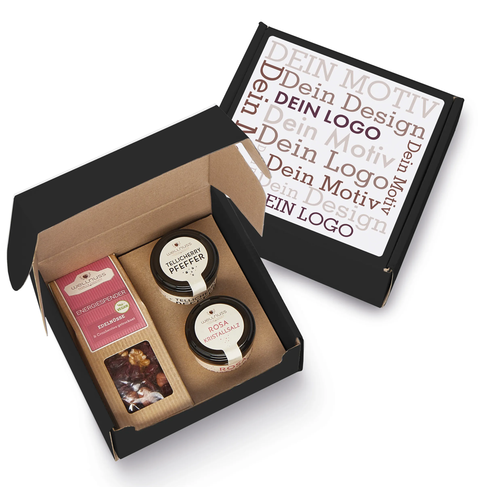 Ab 100 Stück mit Ihrem Etikett im 4c Druck auf dem Deckel des Geschenkkartons: Verschenken Sie Gourmet Gewürze mit Premium Zutaten ohne künstliche Zusatzstoffe und mit Liebe konfektioniert in Deutschland.