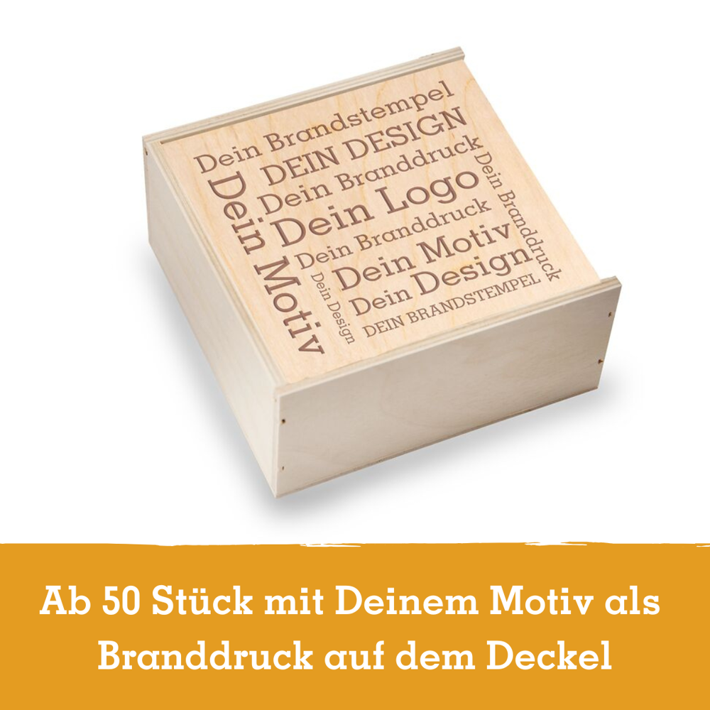 Ab 50 Stück mit Ihrem Branddruck auf dem Deckel der Birkenholzbox: Verschenken Sie Gourmet... mehr